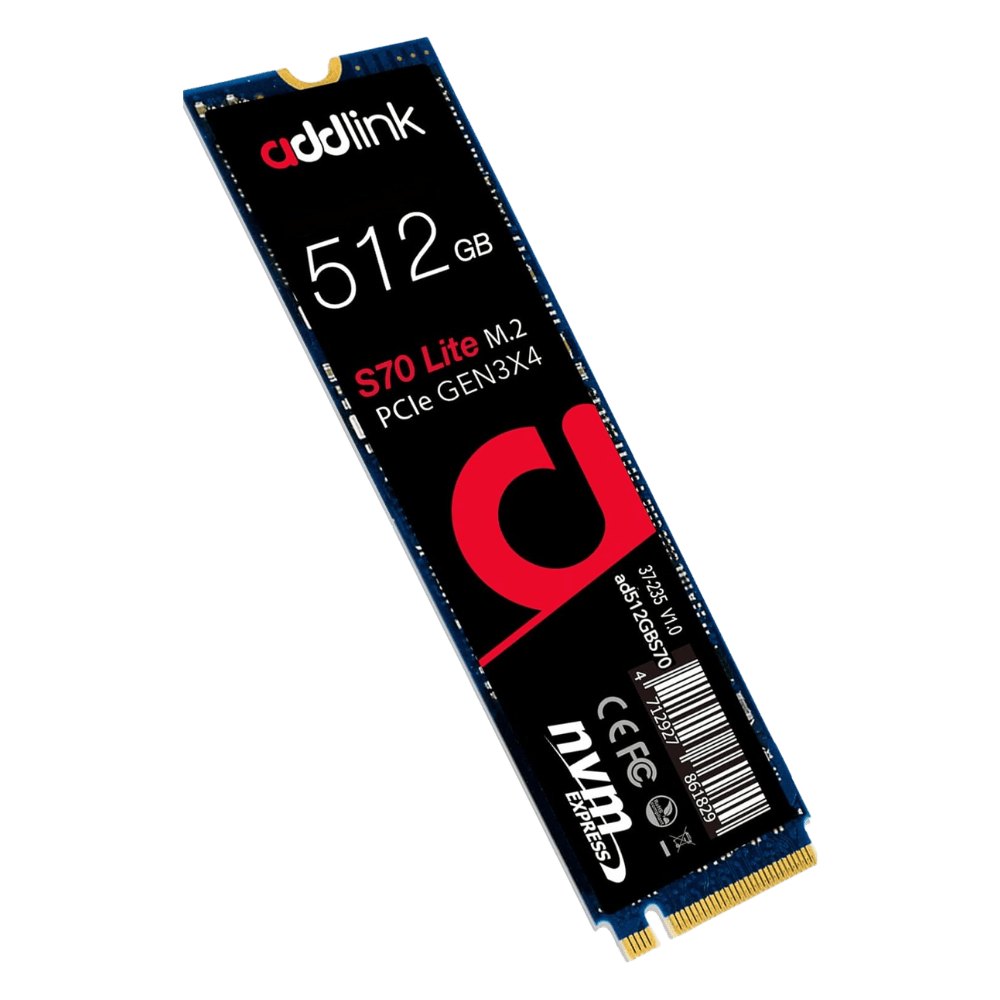 The Addlink S70 512GB SSD is a high-performance M.2 2280 NVMe drive utilizing PCIe Gen 3.0 x4 interface, delivering sequential read speeds up to 3,400 MB/s and write speeds up to 2,000 MB/s.