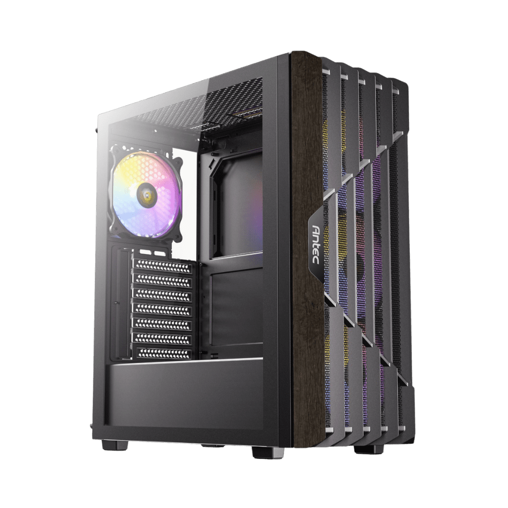 The Antec AX63 Wood ARGB Mid Tower Case combines modern design with functional cooling. Its geometric mesh front panel, complemented by elegant wood accents, ensures optimal airflow while adding a touch of sophistication. The chassis supports ATX, Micro-ATX, and Mini-ITX motherboards and offers ample space for high-performance components.