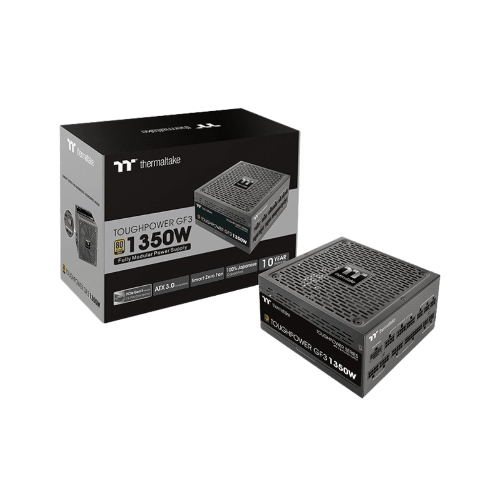 The Thermaltake Toughpower GF3 Gold 1350W TT Premium Edition is engineered to meet the demands of next-generation computing systems. Designed to comply with Intel’s ATX 3.0 specifications, it supports up to 200% power excursion and offers 70% efficiency at low loads, ensuring stable and efficient power delivery even under extreme conditions. The unit features a native PCIe Gen 5.0 12+4 pin connector, capable of delivering up to 600W to PCIe 5.0 graphics cards, eliminating the need for adapters. Its high-quality components, including 100% Japanese 105°C capacitors and a single +12V rail with LLC + DC-DC design, ensure stable voltage regulation and compatibility with demanding components. Safety is prioritized with built-in protections such as Over Current Protection (OCP), Over Voltage Protection (OVP), Under Voltage Protection (UVP), Over Power Protection (OPP), Over Temperature Protection (OTP), and Short Circuit Protection (SCP). With a 10-year warranty, the Toughpower GF3 Gold 1350W is a dependable choice for users seeking efficiency and longevity in their power supply unit.